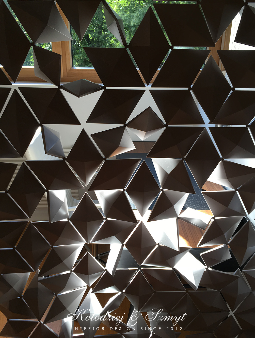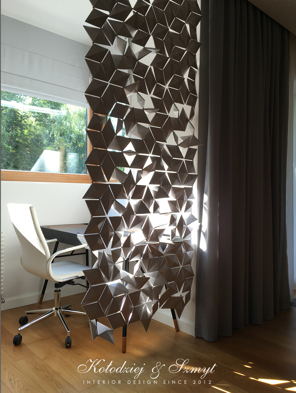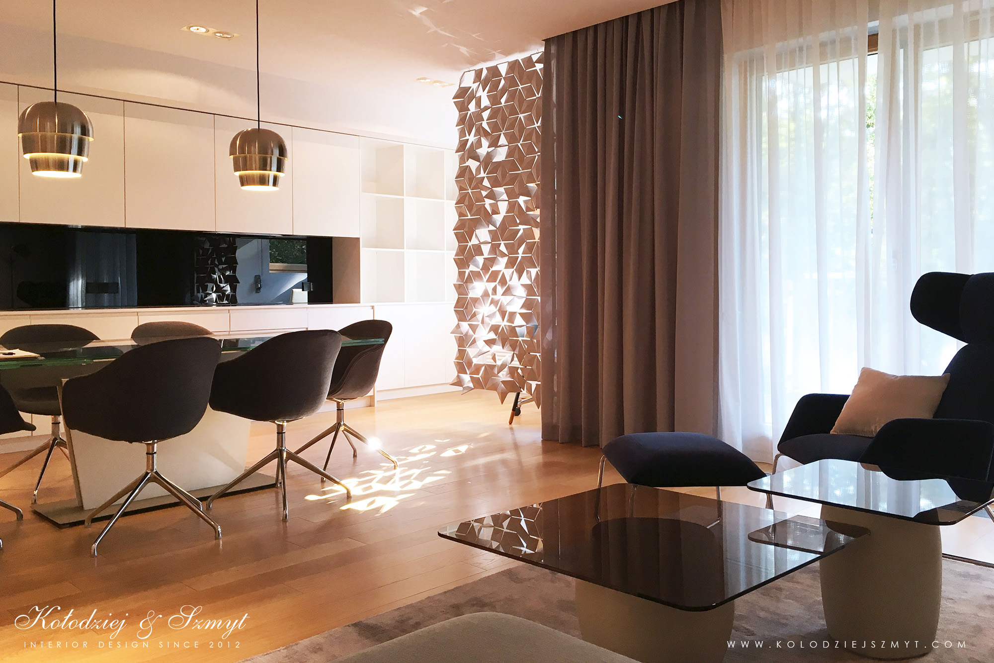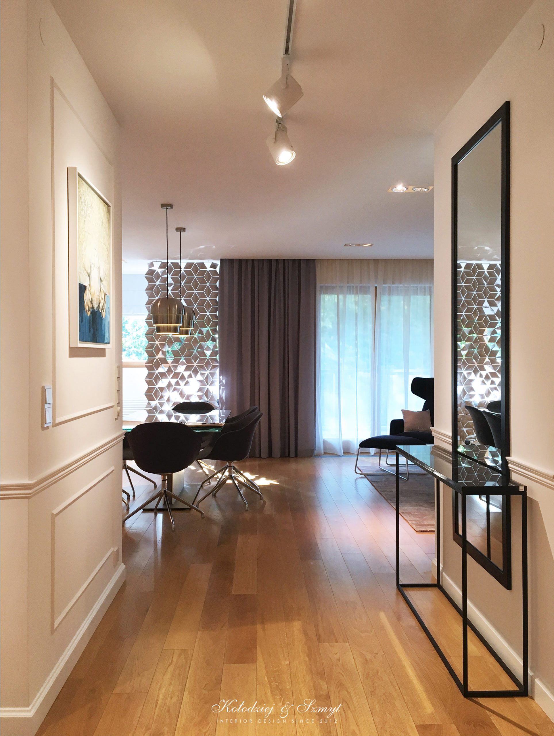 Mieszkanie z rynku wtórnego miałyśmy poddać liftingowi bez zmiany podłóg, łazienki i zabudowy kuchennej która już była wykonana. Prostemu i nowoczesnemu wnętrzu miałyśmy nadać stylowy charakter, dobrać meble ruchome oraz elementy tekstylne i dekoracyjne. Bardzo lubiane przez Inwestorów sztukaterie zaproponowałyśmy na większości ścian oraz dobrałyśmy pasujące do nowego wnętrza obrazy. Uwagę przykuwa ażurowa przysłona wydzielająca kącik do pracy. Składa się ona z niewielkich elementów, które możemy dowolnie „wysterować” i uzyskać taki prześwit jaki potrzebujemy. Przysłona jest niezwykle dekoracyjna a światło przez nią przechodzące intryguje i przyciąga.